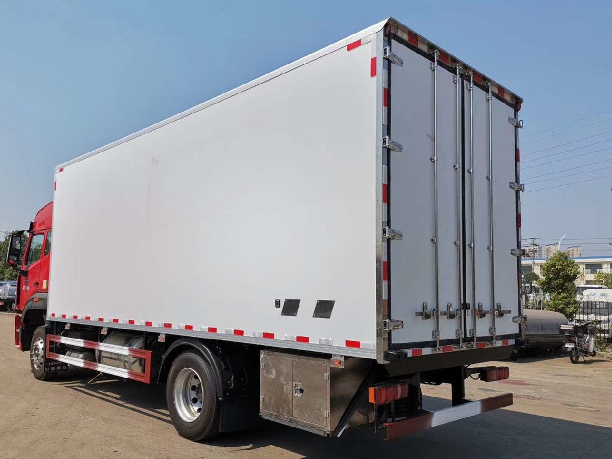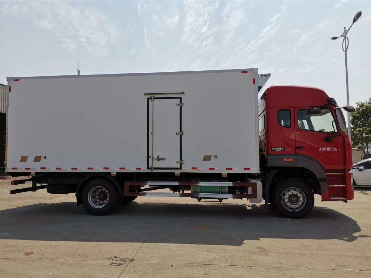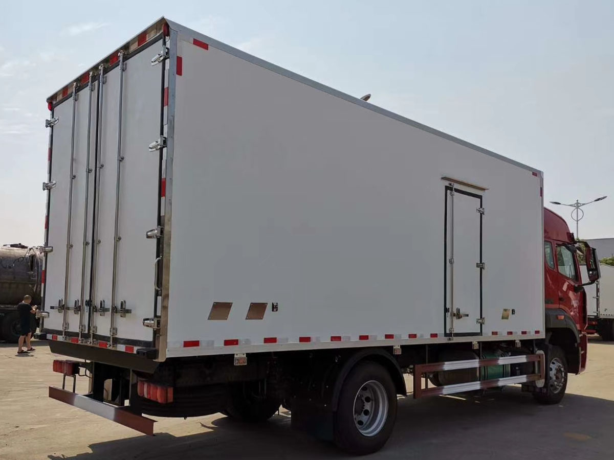 (2)廂板材質(zhì):內(nèi)外壁板選用國內(nèi)優(yōu)質(zhì)玻璃鋼(不吸光、隔熱性好、硬度強、抗氧化);中間保溫層為XPS擠塑聚笨板;廂體厚度8CM。地板采用鋁花紋板,門邊條采用迷宮式橡膠密封條。